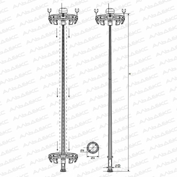 Высокомачтовые опоры освещения, предназначенные для монтажа большого количества светильников (до 12) на высоте, позволяющей увеличить их продуктивность и площадь охвата. Опоры ВМО-35-В исп. 5 заменяют собой сразу несколько стандартных опор освещения, что позволяет полностью окупить их увеличенную стоимость, связанную не только с большой металлоемкостью, но и со сложной организацией конструкций. При этом такие металлоконструкции отличаются оптимальным для своих габаритов весом, не создают излишней нагрузки на грунт, могут быть использованы для подземного подвода кабельной системы, что позволяет отказаться от протягивания дополнительных проводов. Системы используются на стадионах, на промышленных площадках и т.д. Их гармоничный дизайн и современное исполнение, а также возможность обслуживания без привлечения габаритной спецтехники, которой часто требуется специальный подъезд, позволяют использовать их при обустройстве жилых комплексов.
