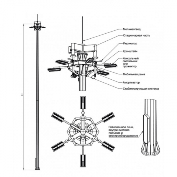 Высота высокомачтовых опор МГФ 20 метров. Их грузоподъёмность составляет до 500 кг. Количество прожекторов в каждой опоре — до 6 штук.
